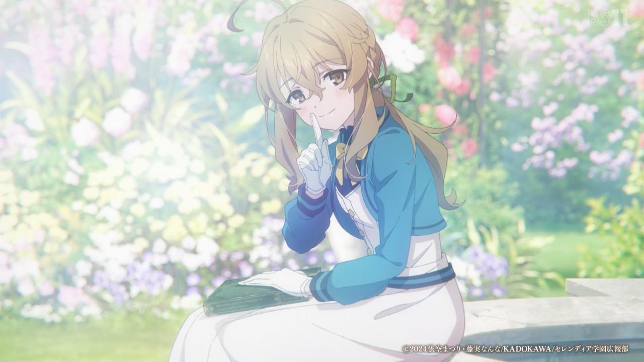 さて。じゃあ昨日書けなかったサイレントウィッチの話を…。前半は奪われた魔導具をめぐってかっこいいモニカちゃんが見れる話。イケメンモニカちゃんね。後半は殿下もといアイクくんとなんかいい感じの雰囲気になる話…結局殿下はまだモニカちゃんの素性については分かってないんだよね。なんか「もうこれ分かっててわざとやってない?」くらいのことになってたけど。そしてモニカちゃんと一夜をともにしてしまう(してたっけ?)これはもうスキャンダルですよ…まあ何が起きるということもなく日常に戻り…終わり?終わりなの?この人全然出てなくない?(そういえばいたね)殿下の運命が読めない件?もまだよく分かんないしこれ分割2クールじゃないかと思ってたけど、特に話は無かったね。では最後にラストシーンのモニカちゃん。かわいい。これで終わったのよかったね。これ「お前余計なこと言うんじゃねえぞ」ってジェスチャーでしょ