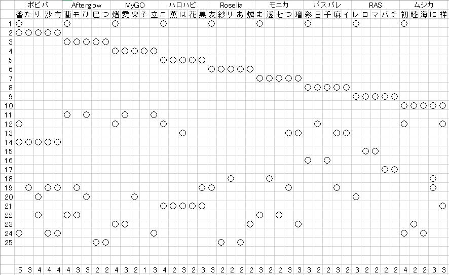 今日は何から。バンドリちゃんやってたね。今日は(一瞬だけ見切れてた11話を除くと)Afterglow回以来のつぐみちゃん登場でした(よく覚えてるな)よく覚えてるどころか集計してるからな(何してるのマジで…)俺はもう集計大好きだから…ちょっと前にアプリ板のバンドリスレで「バンドリちゃんってキャラの登場回数が偏ってない?」ってレスがあって調べだしたのが始まりです。実際に集計した結果、思ったより偏ってない、それどころか満遍なく出るように相当気を使ってる。というのも今回出た4人は全員今まで1回しか登場してないキャラで、これで1回しか出てないのはそよりんだけになった。もし来週そよりんが出たら、半分の26話で全員が2回出たことになる。あー、もう半分になるのね。バンドリちゃん一生やってほしい
