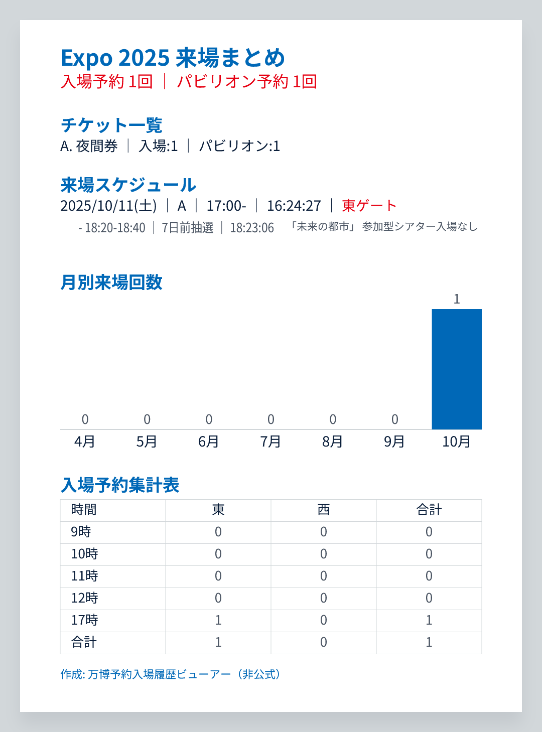 ちなみにおまけ漫画はこれまでで一番意味不明でした。ハハハ。のんのんびよりのスピリットを感じる…。さて。また万博の話ですが、この月末で公式サイトの「マイチケット」が閉鎖されます。昨日くらいまで知らなかったんだけど、そこからAPIを使ってこれまでの入場、パビリオン予約などの履歴をJSON形式で取得できるらしいんだよね。で、そのJSONデータを見やすくまとめてくれる万博予約入場履歴ビューアーってサイトがめっちゃバズってたらしい。へー。じゃあちょっと俺もやってみようって思って、やった結果がこれです。ハハハ。入場予約・1回!しかも夜間。さすがにこれはtwitterで自慢できる数字じゃないからここでひっそり公開しておきましょう。それにしてもtwitter見てみたらすっごい回数行ってる人いるね