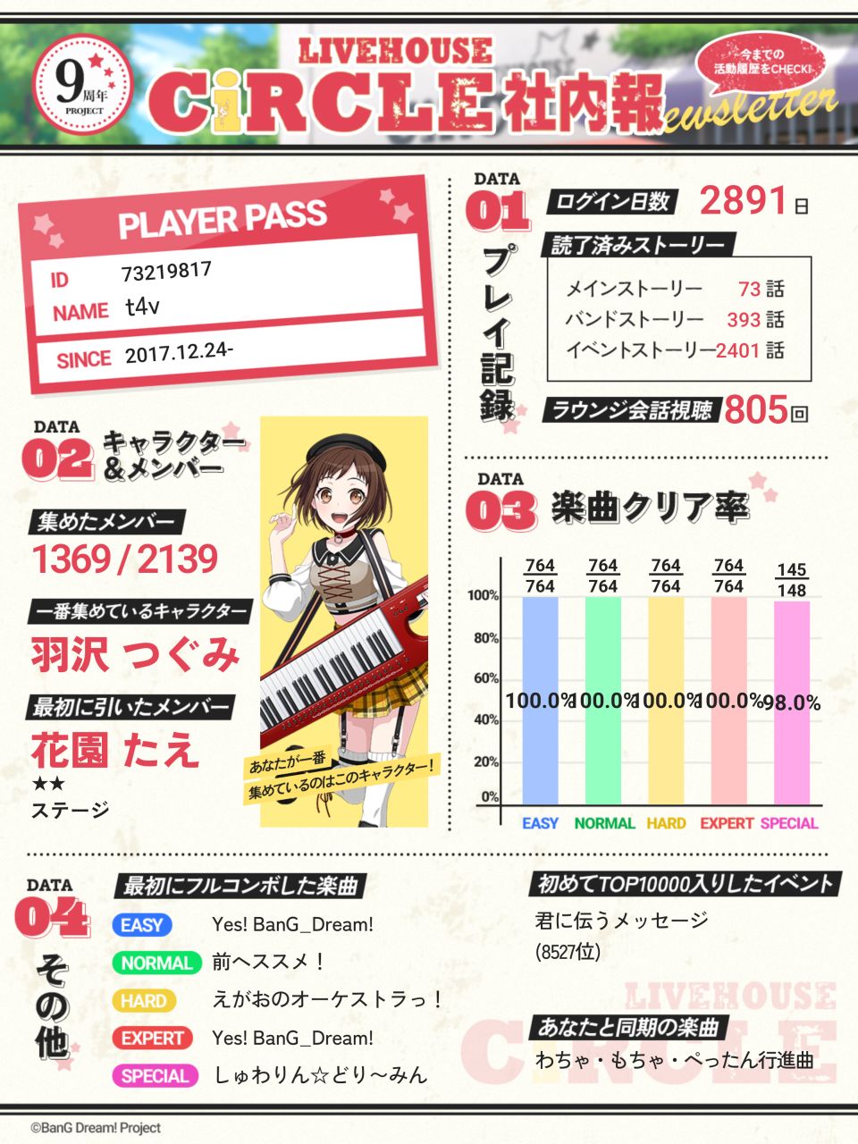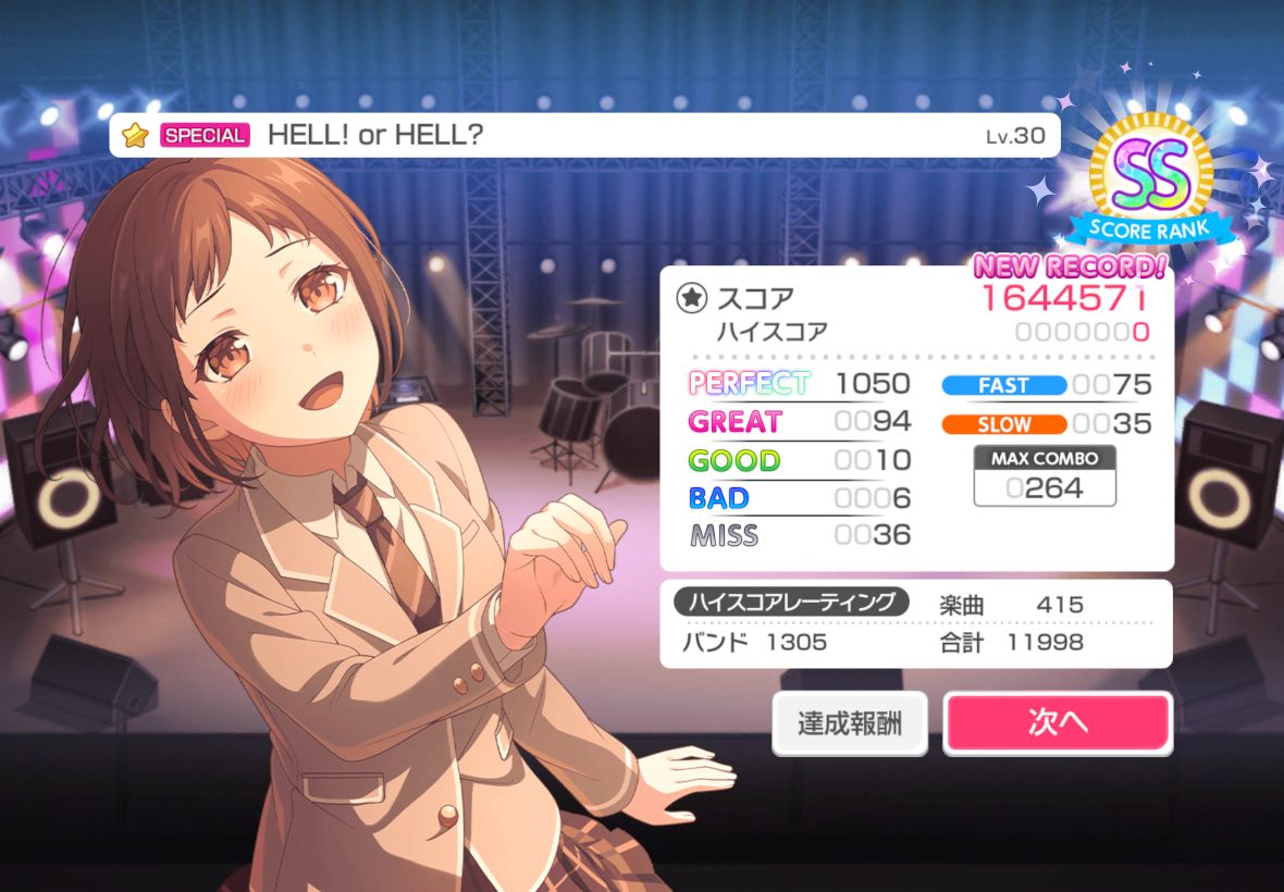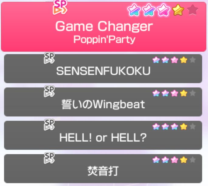 バンドリですが、一応挑んでおこうかと思うのですヤバい譜面に。そしたら驚いたことに、SENSENFUKOKUとHELL or HELLにはクリアマークが付きました。すごい!その2曲はずっと前にクリアしようとして全然できなかった奴だよね。やっぱ上手くなってるわ。ちなみにこれが証拠です(どこが上手くなってんだよ)よく見たらミス36だな。まあ、初めてRinging Bloomクリアしたときもそれくらいじゃなかった?このくらいならクリアマーク付けてあげようよ。ということで残りは3曲、焚音打、Wingbeat、Game Changerです。焚音打はなんとかなんないかな…長すぎて体力が尽きなければ…