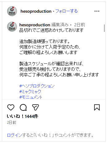 で、諦めたところなんだけど、噂によると、というかメーカーさんの一次ソースだけど、追加生産中で、生産が安定したら受注販売もあるかもですって。おー。いつになるか分からんけどいいね。「検討しております」だけどね。サイレントウィッチでも言ってたよね「適当にあしらいたいときは前向きに検討しますって言っとけ」って。ハハハ。いやでもさ、ミャクミャクグッズのライセンス期間って来年3月までじゃなかった?本当は閉幕までだったのが伸びたんだよね。間に合うのかな?なんかたまごっち騒動みたいだねこの市場に出回らない感じ…。ではまた明日