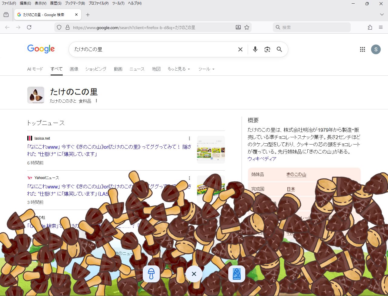 なんか窓の杜で知ったんだけど、今Googleで「きのこの山」か「たけのこの里」を検索すると、画面の下の方に謎のボタンが現れ、それを押すと「きのこ」ボタンと「たけのこ」ボタンに分かれ、それを押すと…なんかすごいことになった。次々ときのこ・たけのこが降ってきます。なんだこれ。落ち方も結構凝ってるな。Googleと明治のコラボ企画らしいよ。へー。ちなみにGoogleは公式でたけのこを推すらしい。ハハハ。ダメだろそんなこと言っちゃ